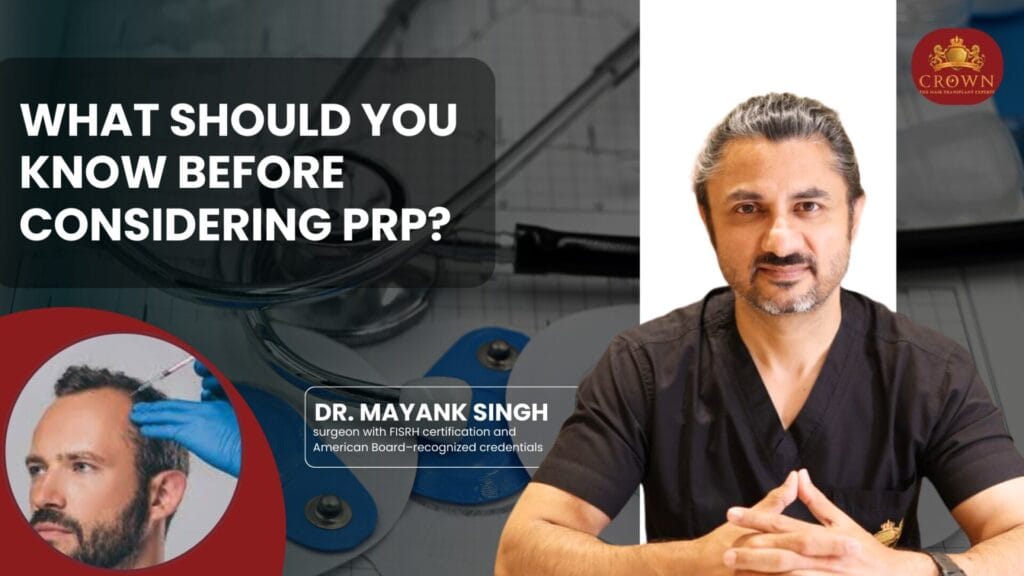 Dr. Mayank Singh is the President of the Association of Hair Restoration Surgeons of India, a Diplomate of the American Board of Hair Restoration Surgery, and a Fellow of the International Society of Hair Restoration Surgeons. He is the only surgeon in India to have received the Shelly Friedman Award. For Hair PRP Treatment, preparation concentration, injection depth, session spacing, and follow-up protocol all determine whether the patient sees results or does not. Each case at Crown begins with a full scalp evaluation. Hair loss pattern, follicle health, scalp condition, and platelet quality are all assessed before a single session is recommended. The treatment plan is built around what the individual scalp requires, not a standard course applied uniformly across patients.